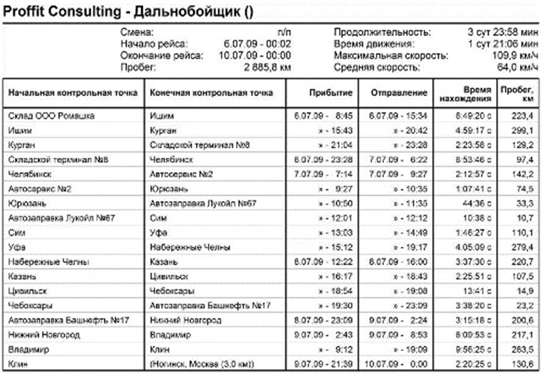 Отчеты о работе транспорта: время в пути и время простоя, соблюдение графика движения, объем истраченного горючего и т. д.